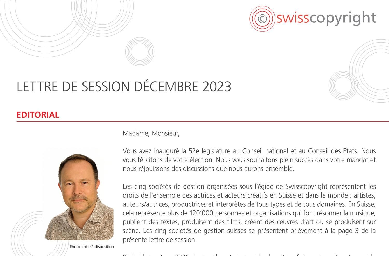 Swisscopyright, l'organisation commune aux cinq sociétés de gestion collective en Suisse, présente sa lettre de session de décembre 2023 contenant des thèmes relatifs au droit d'auteur.