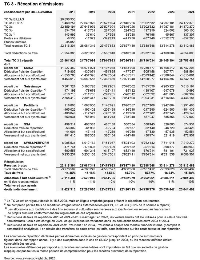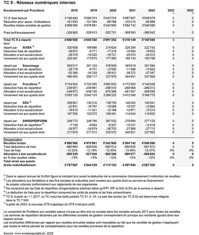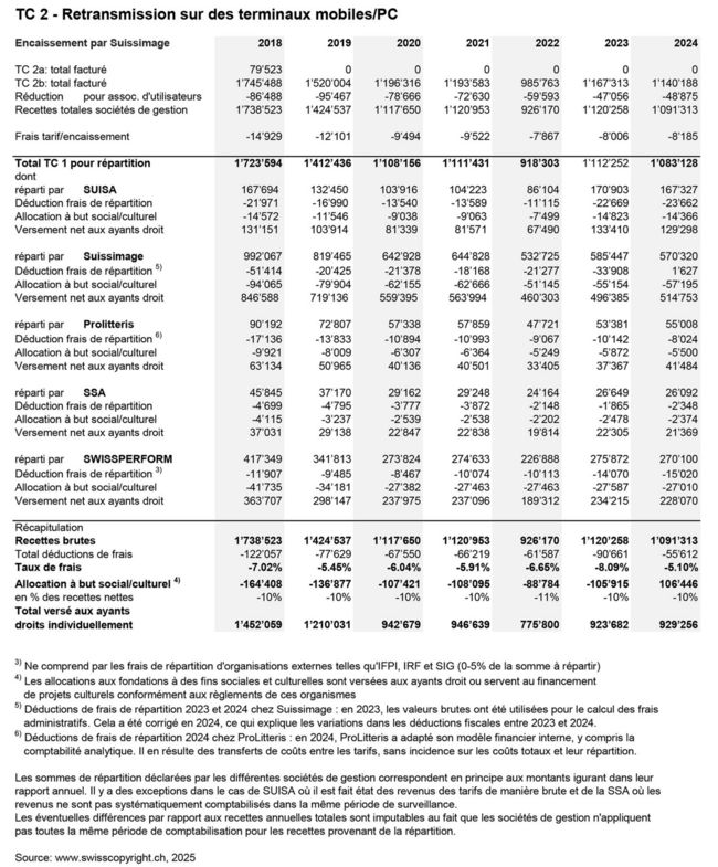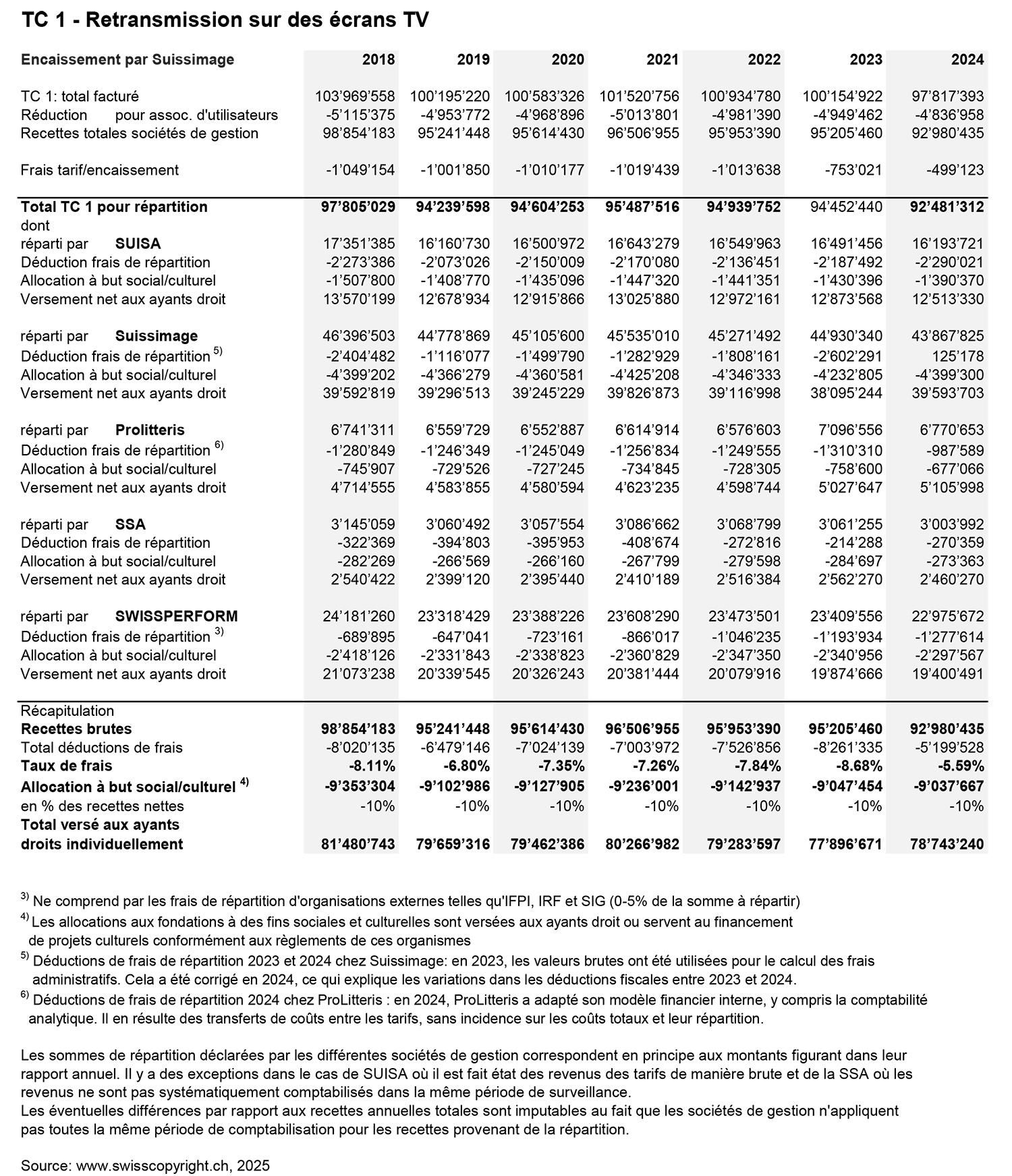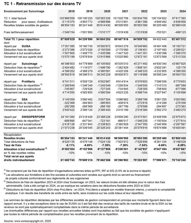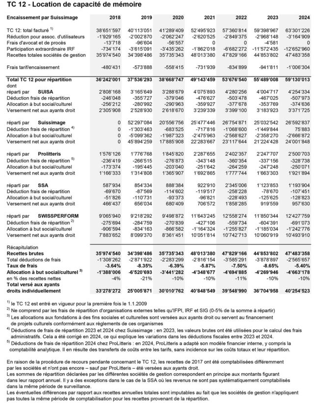 Les tableaux ci-après indiquent précisément les flux de capitaux pour les différents tarifs communs, depuis la facturation aux utilisateurs jusqu’à la répartition individuelle entre les ayants droit.