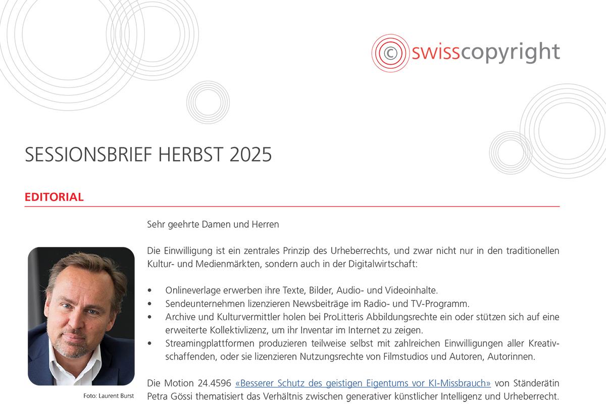 Swisscopyright, das gemeinsame Dach der fünf Verwertungsgesellschaften in der Schweiz, präsentiert den Sessionsbrief Herbst 2025 mit Beiträgen rund um das Urheberrecht.